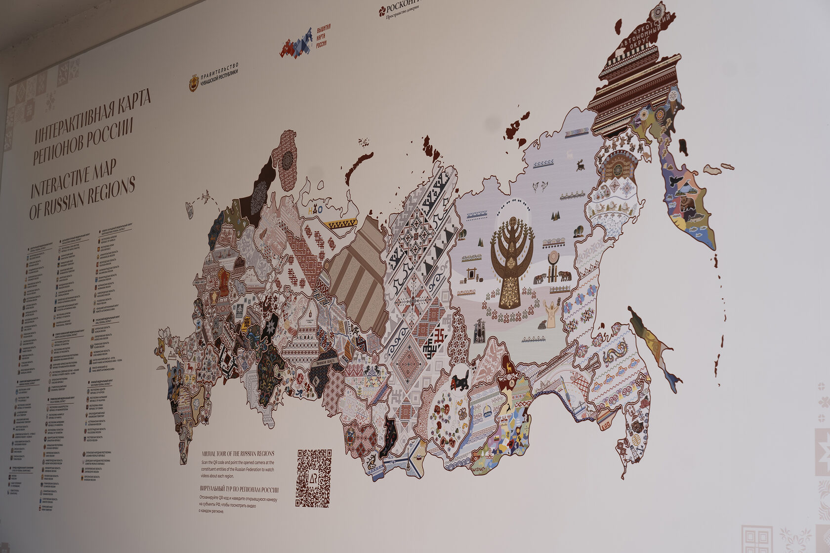 Это шедевр декоративно-прикладного и цифрового искусства. Она создана благодаря сотрудничеству лаборатории актуальных технологий MARMA Фонда Росконгресс с Правительством Чувашской Республики. Дизайн интерактивной карты в точности повторяет «Вышитую карту России» — проект Чувашии, на которой каждый регион оформлен своим традиционным узором.